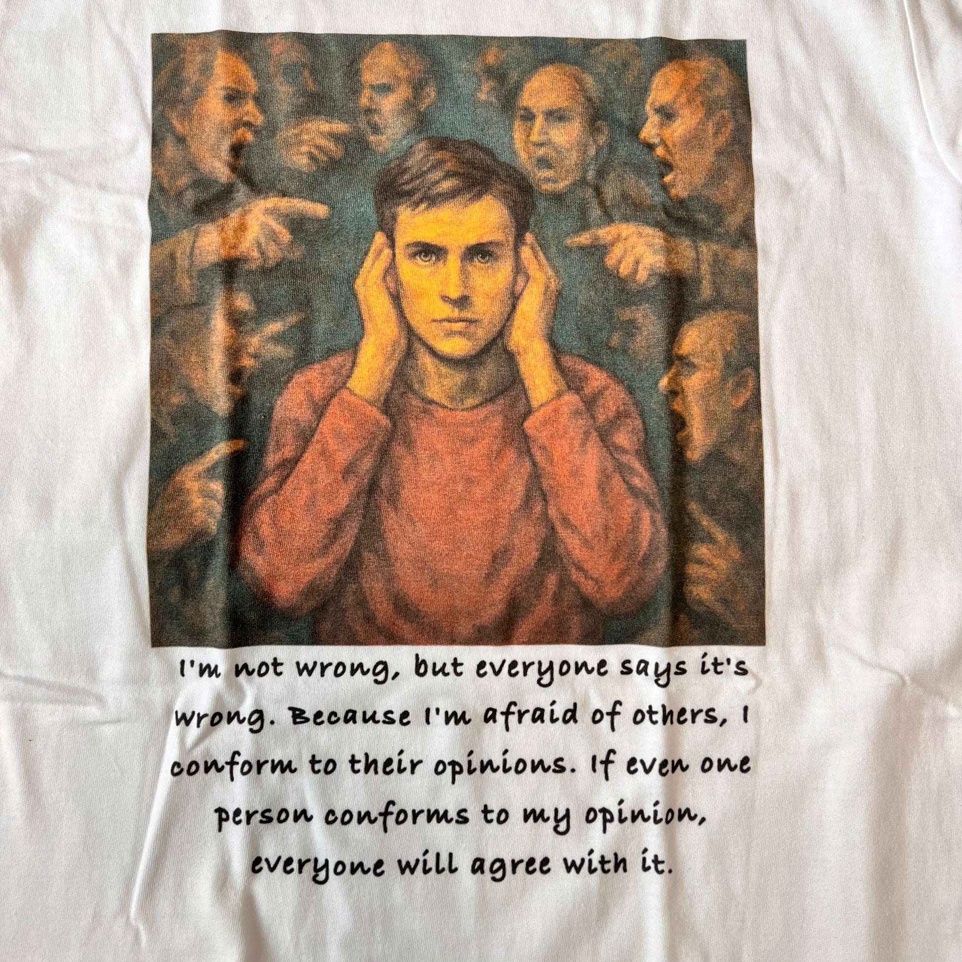 このTシャツは、耳を塞ぎ、まっすぐ前を見つめる一人の男を描いた一枚。